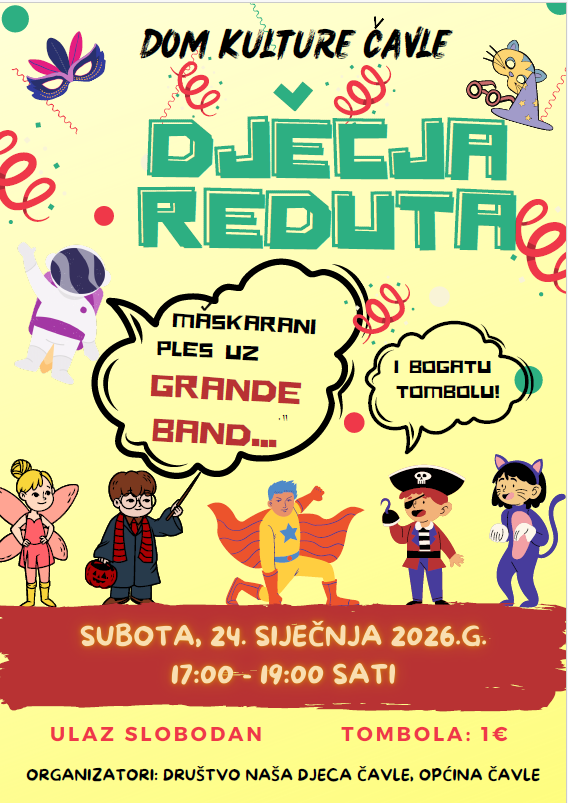 Children’s Carnival at Dom kulture Čavle will take place on Saturday, January 24, 2026, from 5:00 PM to 7:00 PM! Expect lots of fun, music, and dancing, and all young participants are welcome to come wearing masks and costumes of...