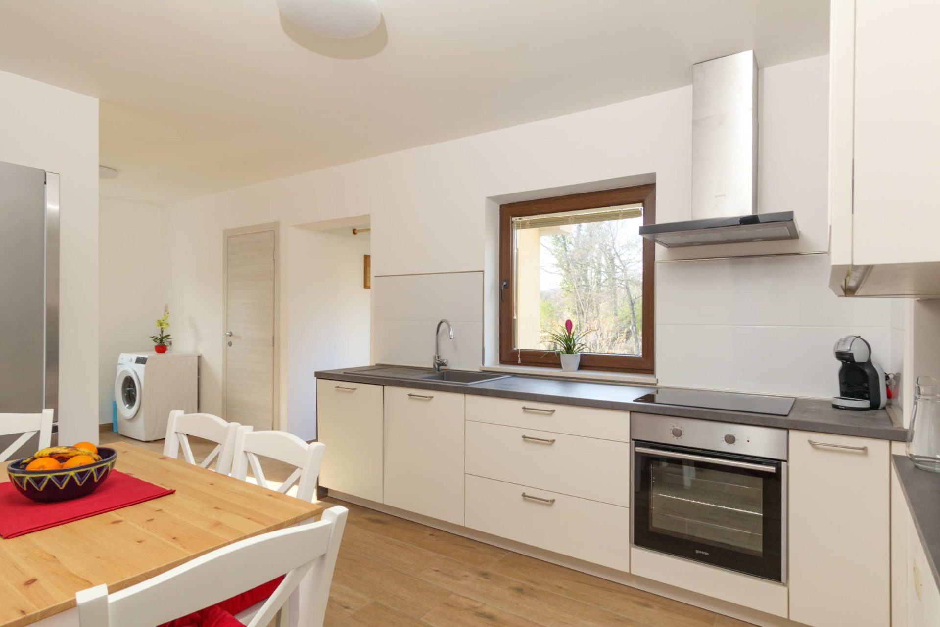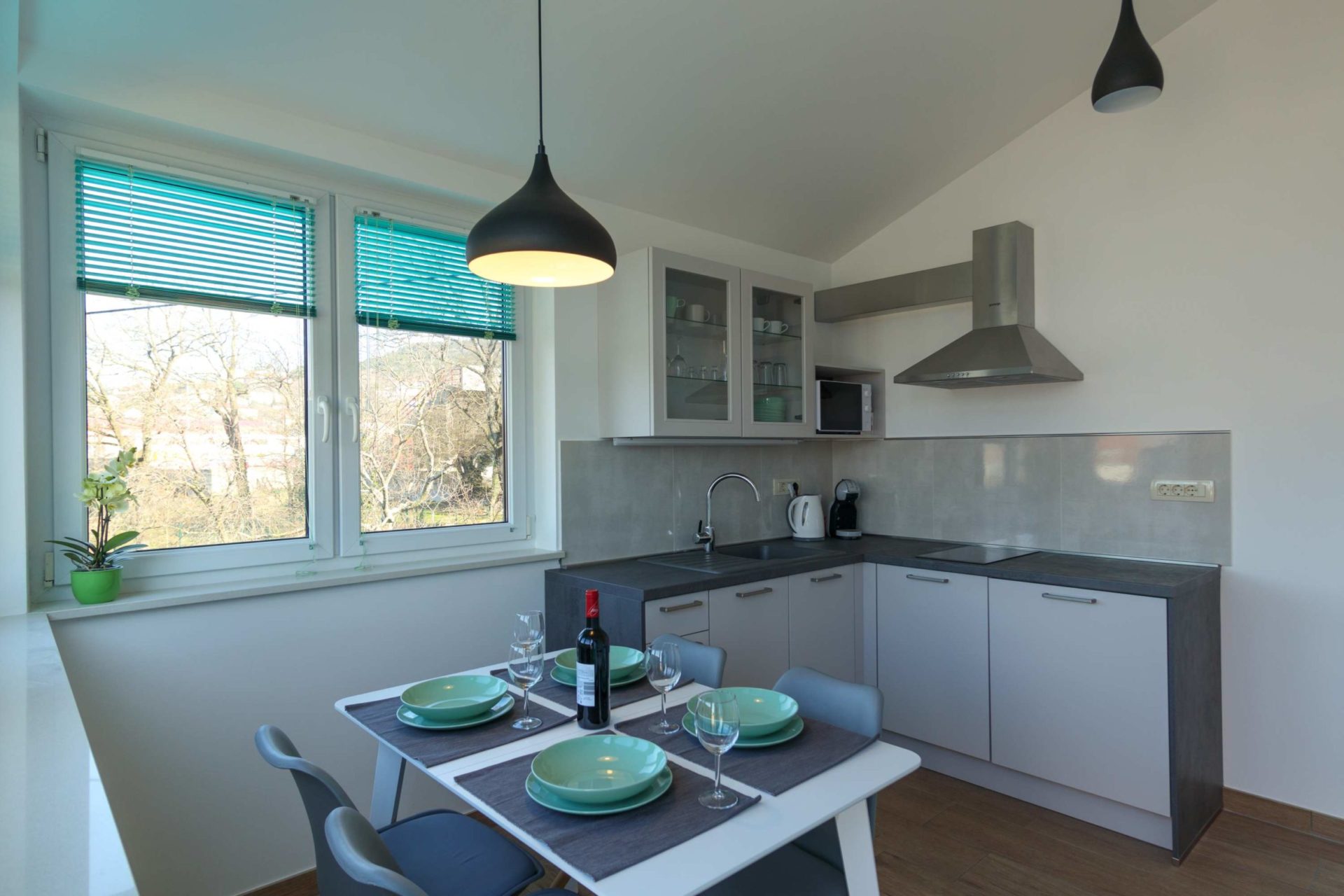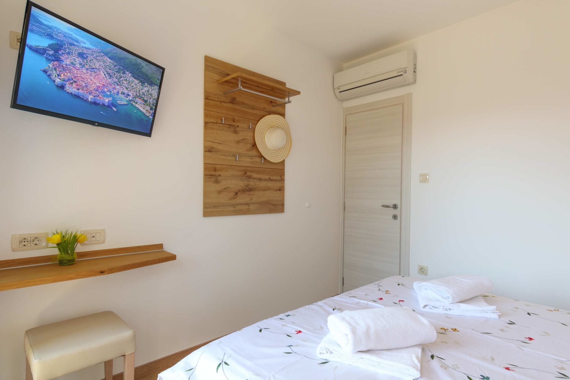 Novi i moderno uređeni apartmani, mogućnost spajanja dva apartmana u kuću za odmor. Potpuno opremljene kuhinje sa svim pogodnostima. Velika terasa sa ležaljkama i garniturom. Walk-in tuš s podnim grijanjem. Sve sobe klimatizirane. Prvi apartman ima 62m2 i kapacitet za dvije osobe i dva pomoćna ležaja, a drugi apartman je za 4 osobe i ima površinu od 55m2.